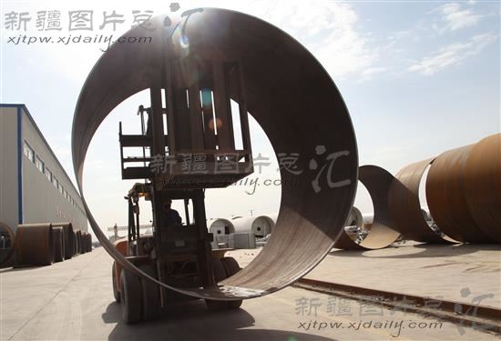 2014年5月15日,工人在位于新疆兵团第十三师红星二场的哈密红星重工有限公司,拉运风力发电风机塔筒。