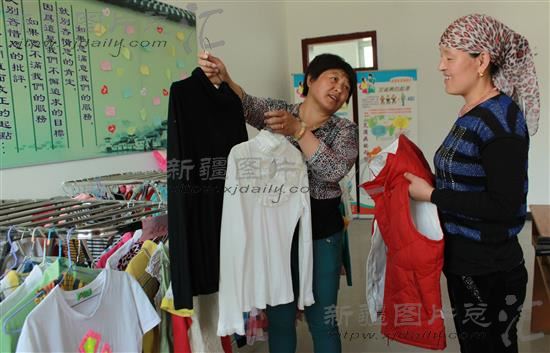 沙湾县安集海镇人口和计划生育生殖健康服务站为流动人口提供亲情化服务,为流动人口募捐了五百余件成人和儿童爱心衣,流动人口可以根据自己的需要选择两到三件衣服。