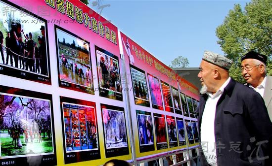 2014年5月17日,市民在伊宁市人民公园欣赏拍客摄影大赛获奖作品。