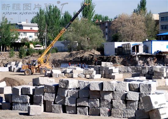 2014年5月19日,博乐市青得里河综合治理工程北京桥施工段,河底整齐地码着用花岗岩边角料重新加工而成的石材。