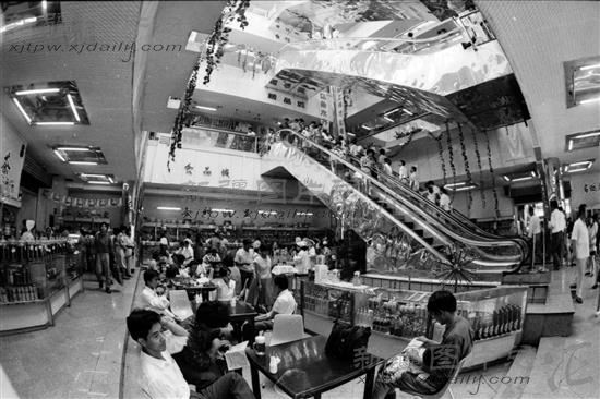 1987年,我区城乡市场繁荣,商品丰富,不断满足各族群众日益增长的需求。图为日均客流量达2万人次的乌鲁木齐红山商场,今年引进安装了大型上下电梯。