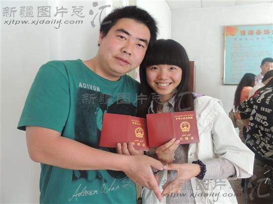 2014年5月20日,一对新人在展示刚领到的结婚证。