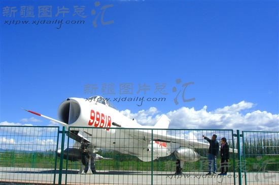 游客在裕民县生态园内参加爱国民生人士巴什拜捐赠的战机(2014年5月16日拍摄)。