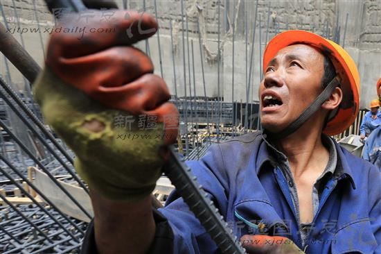 2014年5月21日,工人在“疆电外送”配套煤矿项目——神华国能新疆哈密大南湖露天煤矿输煤系统工地穿插钢筋。