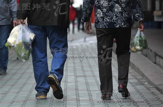 2014年5月23日9时30分,市民拎着刚购买的蔬菜走在公园北街上。