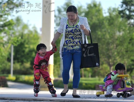 2014年5月25日,市民在乌鲁木齐市南湖市民广场游玩。当日恰逢艳阳蓝天,众多市民纷纷走出家门来到室外休闲、健身。