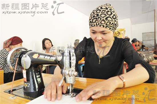 2014年5月26日,哈密市东河区街道上阿牙村的妇女在参加缝纫培训。