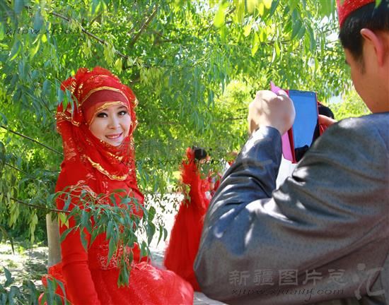 2014年5月24日下午,一对回族新人正在用手机拍照。