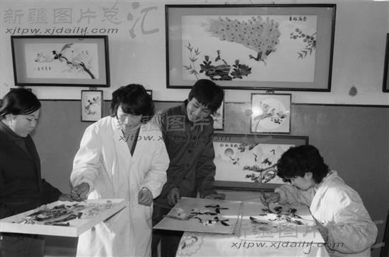 1987年,为美化人们家庭居室,天山制镜厂今年推出羽毛画新品种,图为美术组的青年工人正在组粘羽毛画。