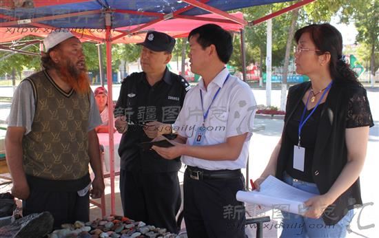 2014年5月27日,社区干部在登记核实流动商贩的信息。