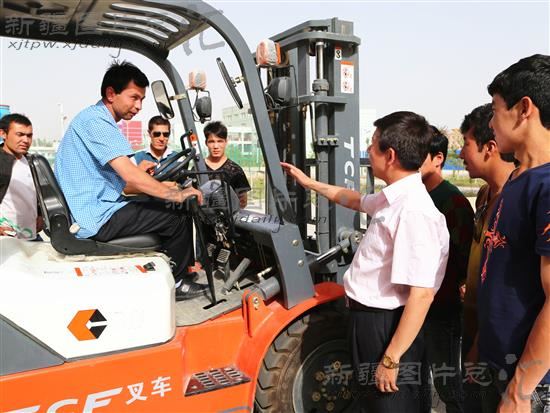 2014年5月27日,学员在库车县中等职业技术学校进行叉车培训。