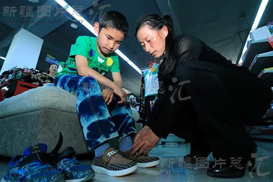 2014年5月27日,全国“创先争优”优秀共产党员、自治区劳动模范、兵团第五师八十四团七连职工王萍(右),在为留守儿童阿依特别克购买鞋子和衣服。