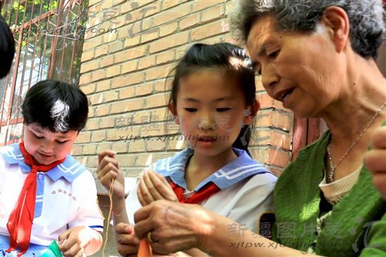2014年5月27日,哈密市东河区安全路社区的小朋友们学习做荷包。