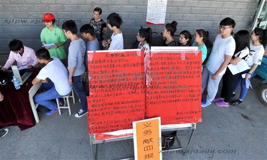 自25日起,由新疆工程学院团委发起的一封“我们的血液相溶、不分你我、不分民族”的倡议书在校园微信平台和校内网站及校园的公告栏里迅速传开,得到了全校师生的积极响应。“我们中午1点左右到达校园,前来献血的师生实在太多了,我们只好采用排号献血。”17时许,当记者来到新疆工程学院设在乌鲁木齐市经济技术开发区艾丁湖路校区的采血点,乌鲁木齐市血液中心工作人员王梦璇一边对献血者进行采前血液对照一边向记者介绍到。