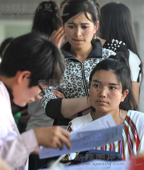 2014年5月27日,在新疆工程学院采血点,来自英吉沙县苏盖提乡坎提日克村的大二学生布威再乃普·乌普热(右一)在进行个人信息录入。