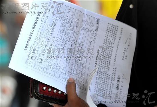 2014年5月27日17时许,在新疆工程学院采血点前,一名献血者手持无偿血液表在等待献血。