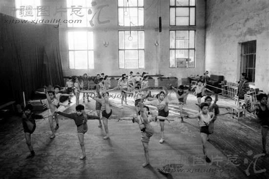 新疆艺术学校少儿杂技班的学员在音乐伴奏下紧张进行基本功训练(摄于1987年)。