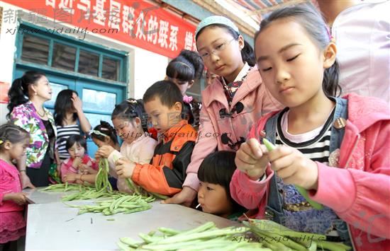 2014年5月27日,哈密市西河区街道西菜园村的小朋友在比赛穿豆角。