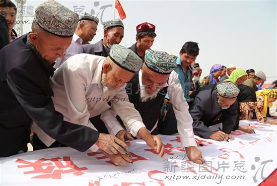 2014年5月28日,库车县齐满镇干部群众在写有“自觉抵制非法宗教、远离违法犯罪、坚决与暴恐分子作斗争、坚决维护民族团结”的长幅上签字。