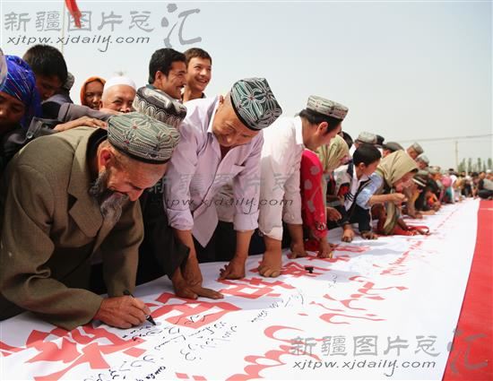 2014年5月28日,库车县齐满镇干部群众在写有“自觉抵制非法宗教、远离违法犯罪、坚决与暴恐分子作斗争、坚决维护民族团结”的长幅上签字。