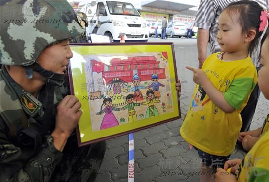 2014年5月28日,乌鲁木齐市棉花北街社区强大小博士第五幼儿园小朋友将亲手绘制的图画送给维稳一线的武警官兵。