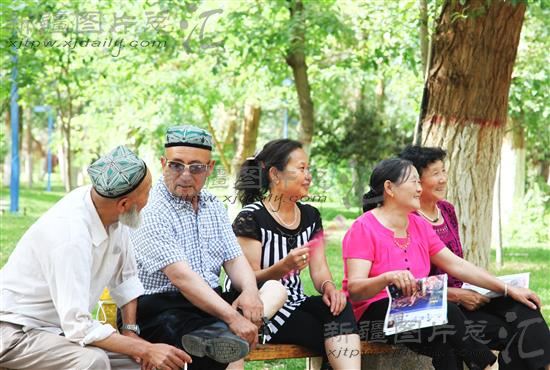 2014年5月29日,几名市民在吐鲁番市麦西莱甫广场的树荫下避暑。