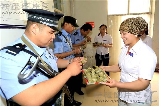2014年5月29日,新疆哈密市新市区阳光社区居民为所执勤民警送去粽子。