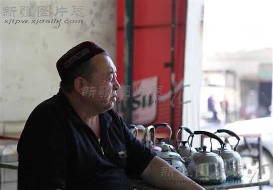 炒好菜等客人的时候,热合曼静静地坐着,休息片刻。