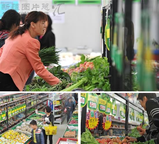 2014年6月2日,乌鲁木齐市水磨沟区苇湖梁片区新光社区蔬菜副食品直销点,居民在选购果蔬(上);6月2日,乌鲁木齐市水磨沟区苇湖梁片区新光社区蔬菜副食品直销点,居民在选购果蔬。(左下);一名居民在直销点选购特价蔬菜(右下)。