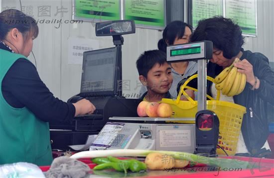 2014年6月2日,乌鲁木齐市水磨沟区苇湖梁片区新光社区蔬菜副食品直销点,居民在排队结账,低廉的价格新鲜的时蔬满足了居民的需求。