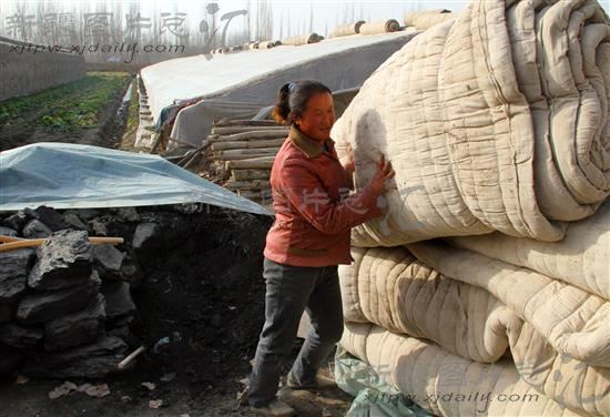 2013年11月19日,新疆阿克苏地区温宿县托乎拉乡托万克苏布拉克村的农民在摆放棉被。随着天气转冷,温宿县早安排早部署,组织县园艺站技术人员,深入温室种植基地,指导菜农购买棉被、煤炭、木支架等物资,强化蔬菜保暖防冻措施,确保全县温室蔬菜安全越冬。