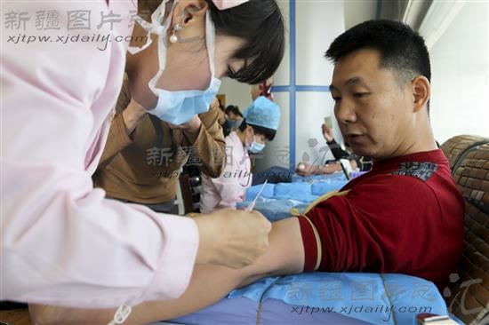 2013年10月31日,在乌鲁木齐市血液中心,如家快捷酒店头宫店员工刘华茂在献血。当日,乌市红庙子街道红十字会举行“每一个无偿献血者都是英雄”的献血活动,来自该辖区酒店、市场等45名外来务工人员和个体经营户进行了无偿献血。据了解,该街道长期组织有400多人的志愿者献血队伍,每年组织2次献血活动。