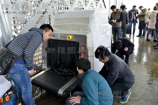 2013年11月21日,在乌鲁木齐市火车南站BRT1号线入口处,工作人员在安装、调试X光安检扫描仪。据了解,从11月20日起,BRT1号线机械厂、儿童公园、碾子沟、火车南站4个站台,陆续安装了4台X光安检扫描仪,经过设备调试、人员培训等前期准备工作之后,预计下周投入使用。