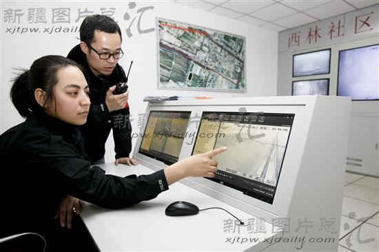 2013年11月26日,在乌鲁木齐经济技术开发区(头屯河区)西林社区的视频分控室,工作人员在查看监控画面。据了解,该社区辖区内出租房、自建房占一半以上,近3千户居民中流动人口占76%之多。今年年初,该社区被选为乌鲁木齐经济技术开发区(头屯河区)数字化全面监控试点基地。到目前为止,已安装高清摄像头106个,6名监控人员24小时轮流值班,社区已实现所辖区域“无缝隙全覆盖”的监控网络。