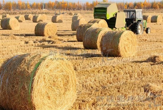 2013年11月3日,新疆生产建设兵团第一师12团职工将稻草打捆储藏。今年,第一师种植的15万亩水稻稻草统一打捆装运,收集稻草作为饲料用于发展养殖业。避免了以往焚烧稻草污然环境现象。