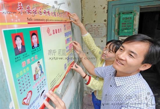 2014年6月4日,库尔勒市平安社区的工作人员在小区单元门口悬挂网格化服务便民宣传栏。