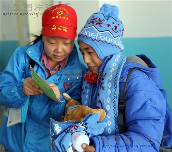 2013年12月19日,志愿者与孩子共同分享温暖包里的寄语。当日,新疆喀什地区伽师县96名孤儿、事实孤儿分别得到了壹基金温暖包,价值365元的棉衣、鞋帽、学习用具、防灾减灾儿童读本和毛绒袋鼠玩具等。