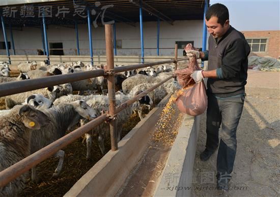 2013年11月30日,吐鲁番市艾丁湖乡规范化养殖示范小区养殖户在喂养育肥羊。近日,总投资7990万元的艾丁湖乡规范化养殖示范小区全部建设完成。养殖示范小区不仅无偿为养殖户提供养殖棚,还为牲畜提供免费防疫。