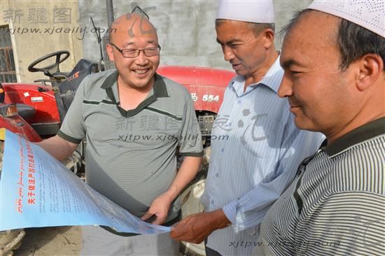2014年6月6日,阿瓦提县拜什艾日克镇义务宣讲员在向群众宣传自治区打击暴恐专项行动的通告。