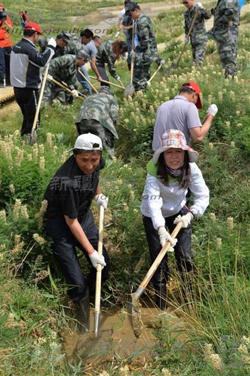 2014年6月9日,新疆伊吾县机关干部和下马崖乡住村工作组帮助当地农民清理沟渠中的淤泥。