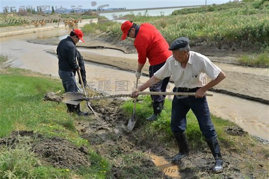 2014年6月9日,新疆伊吾县机关干部和下马崖乡的农民在泉眼旁清理沟渠中的淤泥。