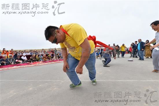2014年6月9日,新疆伊吾县下马崖乡清泉节,农民在进行押架比赛。