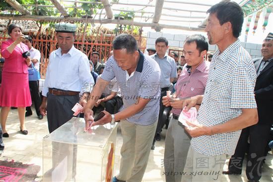 2014年6月9日,库车县哈尼喀塔木乡阿克艾日克村的干部群众,自发为村里的6名贫困户捐助住房款7万元,帮助他们筹集安居富民工程自筹款部分。