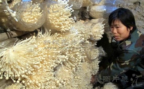 2013年12月16日,新疆生产建设兵团第八师143团18连女工李英忙着为客户采收金针菇。李英今秋刚忙完地里活,便利用冬闲时间培育金针菇实现多元增收。目前,他培育的一万多袋金针菇,巳开始出菇上市,以每公斤10元的价格批发给经销商和销售点,一个冬春下来,可增收5万多元。