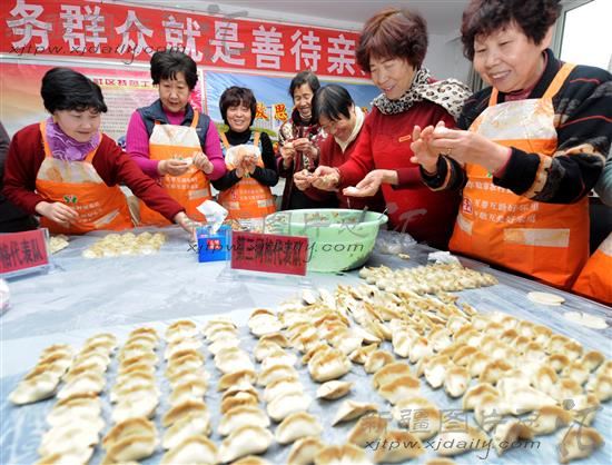 2013年12月18日,库尔勒市萨依巴格街道孔雀社区居民在社区包饺子。当天上午,来自该社区60多名居民欢聚一堂,用包饺子的形式迎接一年一度冬至节,并将包好的饺子送给辖区贫困户。