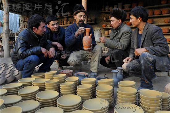 2013年12月19日,阿克陶县在巴仁乡沙依瓦克村土陶艺人阿吉·艾买提(中)给学徒传授土陶工艺,今年57岁的阿吉·艾买提是自治区级土陶技艺传承人,他制作的土陶品种达一百多种,年销售40余万元。去年阿吉·艾买提成立土陶手工艺人专业合作社。还招收了40多名当地农民,一起学习土陶制作技艺共同致富。