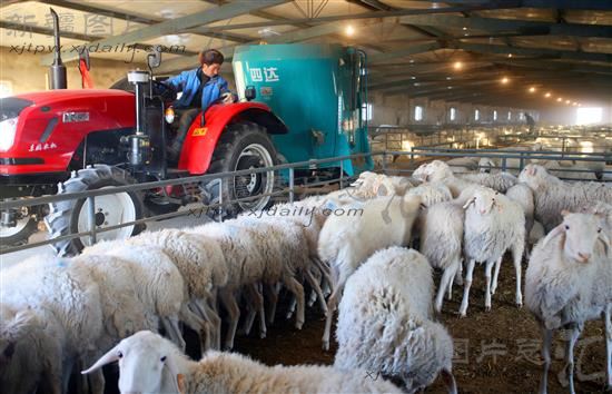 2013年12月11日,工作人员在养殖小区用机械投料。今年以来,新疆巴音郭楞蒙古自治州且末投入4000万元,已建成标准化养殖小区17个,建筑面积近10万平方米,养畜5万头只,并实现饲养机械化。此举不但提高了科学养殖水平,还节省了人工,受到广泛欢迎。