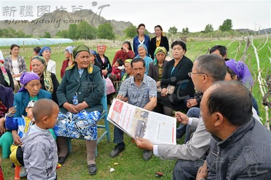 2014年6月10日,伊吾县吐葫芦乡拜其尔村住村工作组和村民学习第二次中央新疆工作座谈会精神。