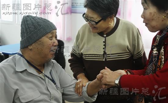 2013年12月12日,76岁的闫允礼老人戴上棉线帽子后非常开心。当日,克拉玛依市白碱滩区钻井社区爱心妈妈志愿者团队开展“牵手温暖,爱送老人”暖冬行动,10位爱心妈妈代表来到白碱滩区为老服务中心,给居住在这里的近百位老人送上自己亲手编织的棉线帽子。