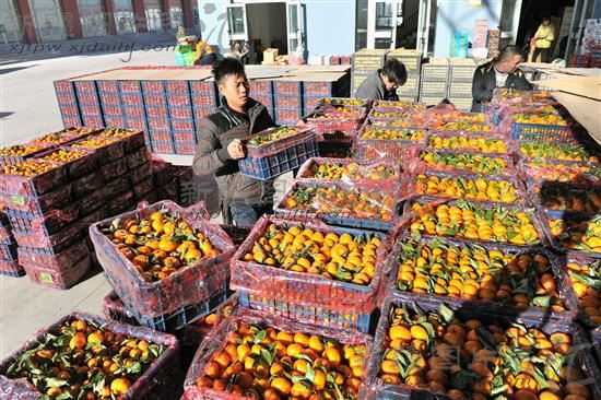 2013年12月11日,水果批发商在摆放蜜橘。伊宁市城东蔬菜水果批发市场开业两周来,已有100余家商户在此经营。该市场紧邻伊宁市东郊客运站,内部设施齐全,是目前伊宁市功能较齐全的一个蔬菜水果批发市场。